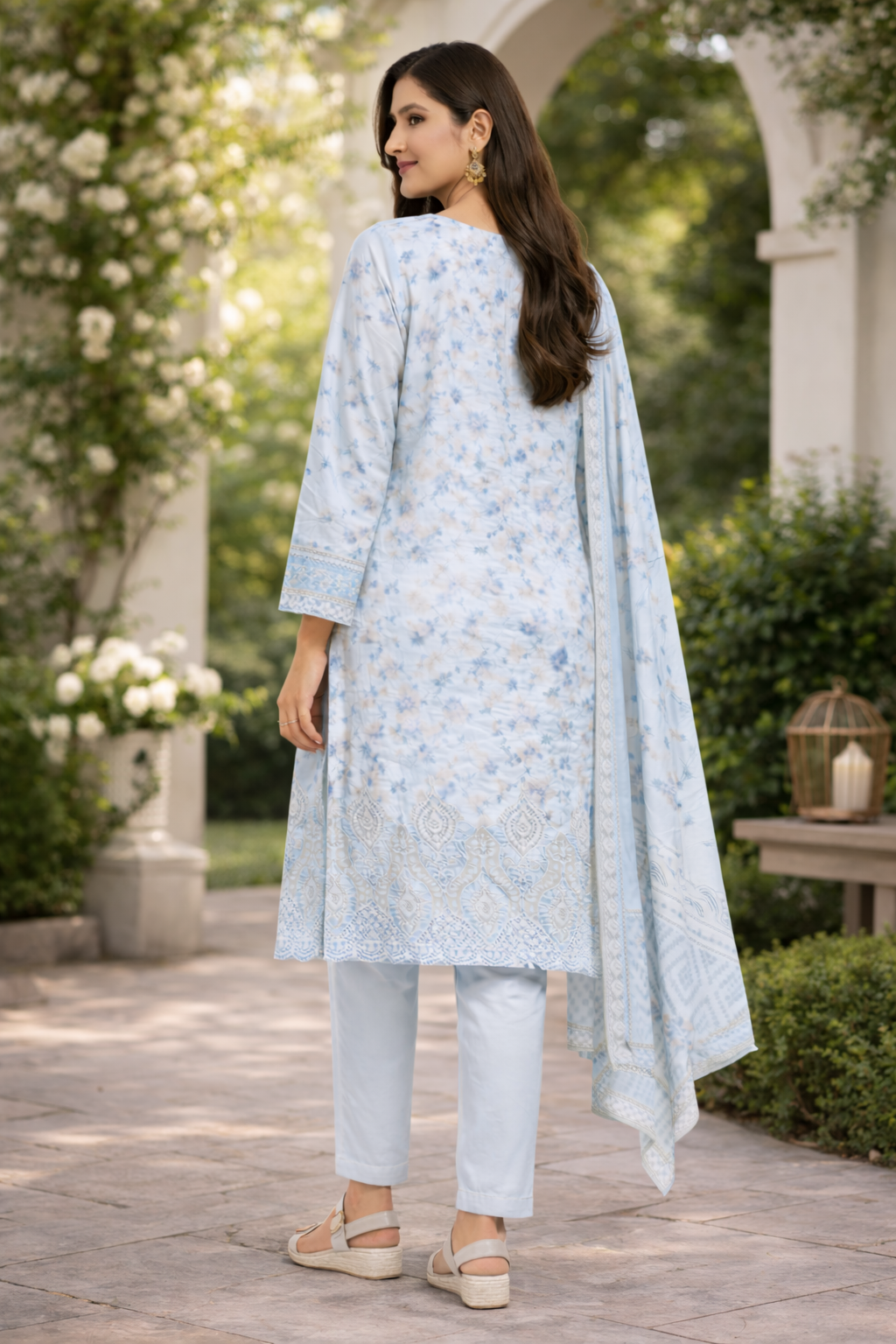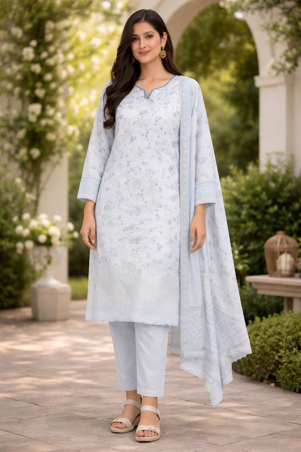 This elegant light blue 3-piece suit designed with delicate floral patterns and refined embroidery. The outfit features a beautifully tailored kurta adorned with soft floral prints and intricate embroidery along the hemline and sleeves, creating a graceful and feminine look. The neckline is finished with subtle detailing that enhances the overall elegance of the design.
